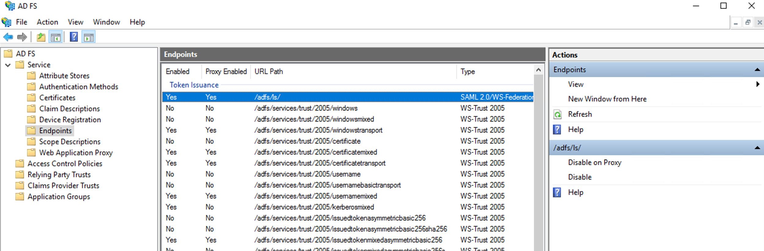 https://домен/adfs/ls.В консоли управления откройте Endpoints и убедитесь, что для параметра Proxy Enabled у