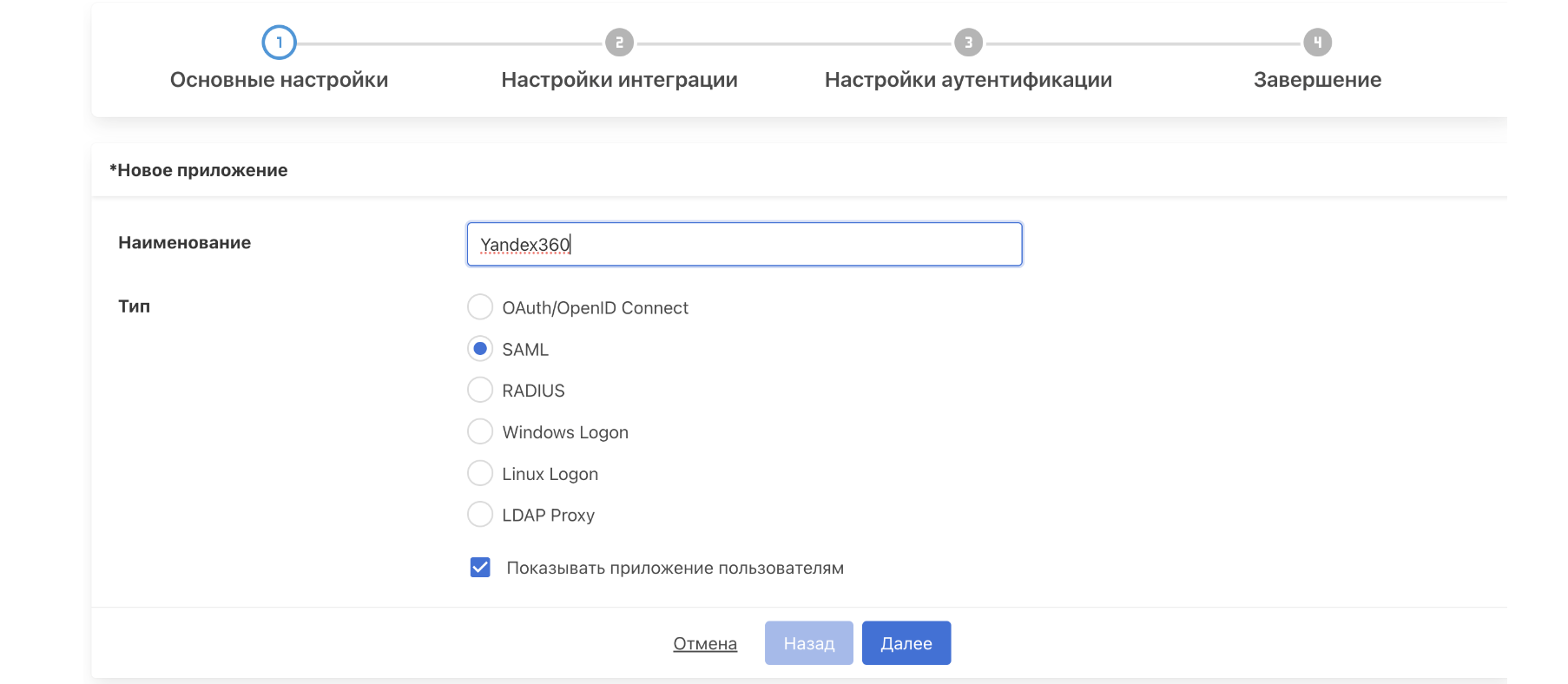 Чтобы организовать единый вход (SSO) в сервисы Яндекс 360 через систему единой аутентификации Avanpost FAM, нужно предварительно создать и настроить SAML-приложение.
