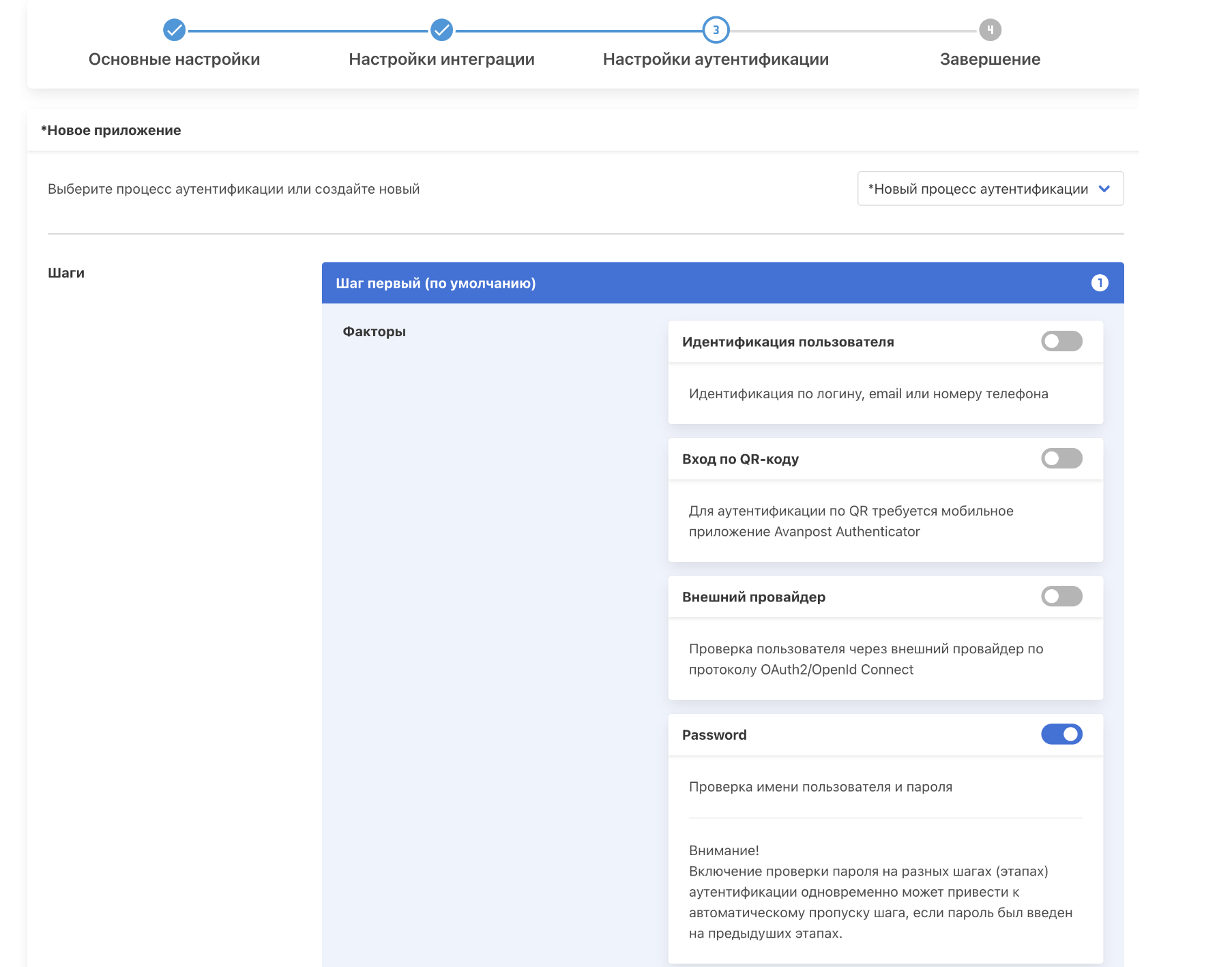 Для нового процесса аутентификации задайте проверку по имени пользователя и паролю — включите метод Password в предлагаемом списке факторов.