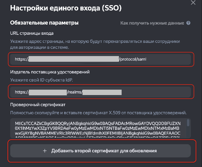 Если вы планируете возвращаться к работе с предыдущим поставщиком удостоверений, то не изменяйте проверочный сертификат, а добавьте новый, нажав кнопку Добавить второй сертификат для обновления. Тогда для возврата к предыдущему IdP потребуется заменить только два поля: URL страницы входа и издателя.