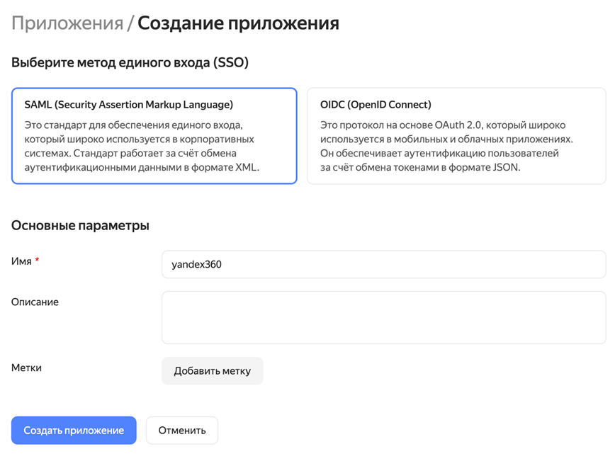 Выберите метод единого входа (SSO) — SAML и укажите произвольное название приложения в поле Имя, например «yandex360».