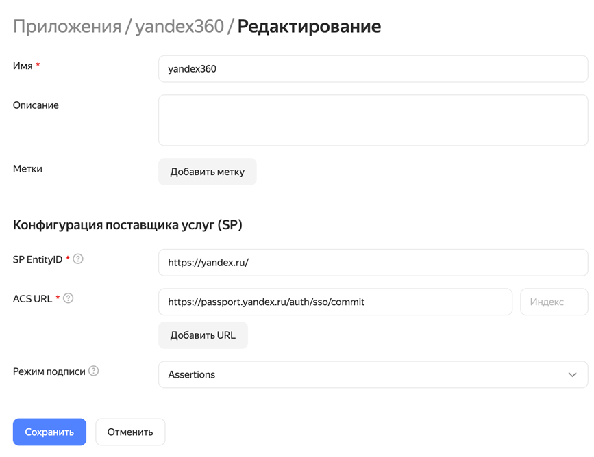 https://yandex.ru/, а в поле ACS URL введите Service URL:https://passport.yandex.ru/auth/sso/commit.