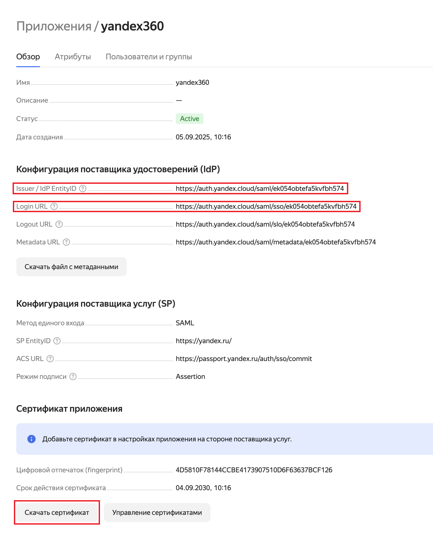 Для настройки SSO в Яндекс 360 вам потребуются следующие данные: