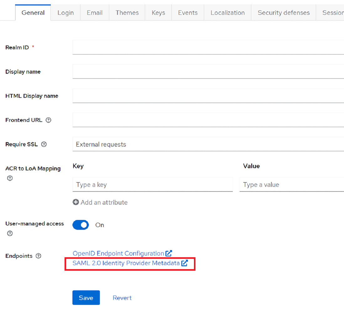 1. В консоли управления на панели слева выберите Realm Settings и нажмите ссылку SAML 2.0 Identity Provider Metadata.