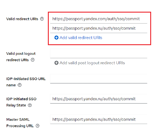 https://passport.yandex.ru/auth/sso/commitиhttps://passport.yandex.com/auth/sso/commit. Если ваши сотрудники пользуются сервисами Яндекс 360 на языковых доменах, дополнительно добавьте их URL в качестве конечных точек.
