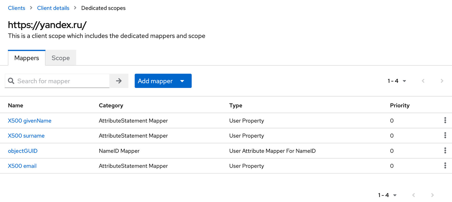 На вкладке Client scopes откройте Client scope, который соответствует создаваемому клиенту, например