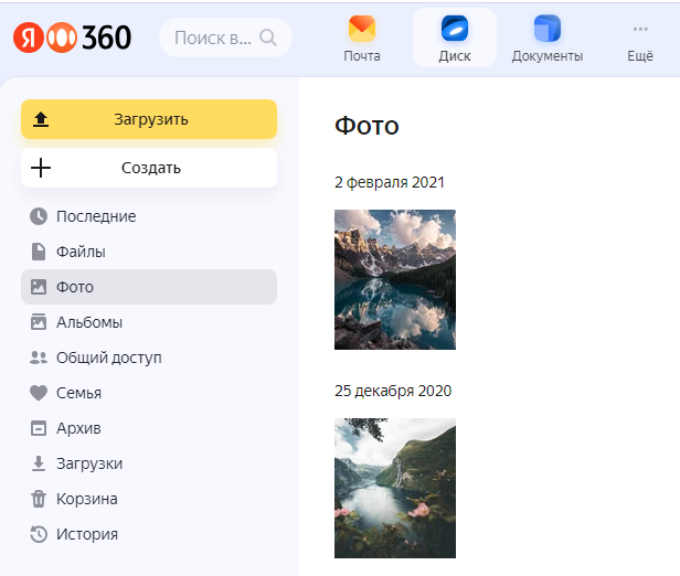 Все фотографии на Диске собраны в раздел «Фото» для удобного просмотра.