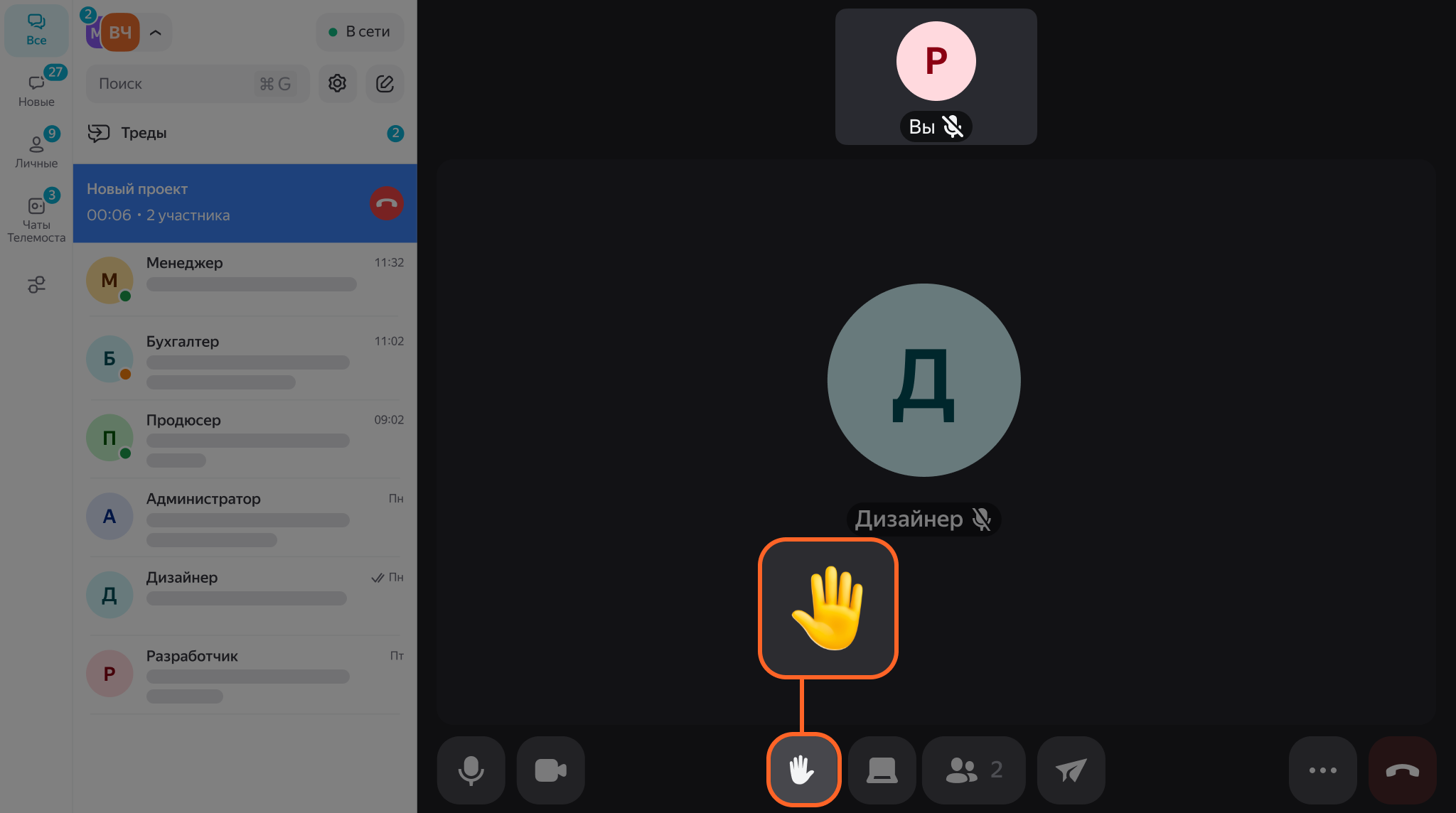 Если нужно задать вопрос или привлечь внимание других участников, нажмите на значок руки на панели внизу. В углу вашего портрета появится поднятая рука, видная всем участникам звонка.