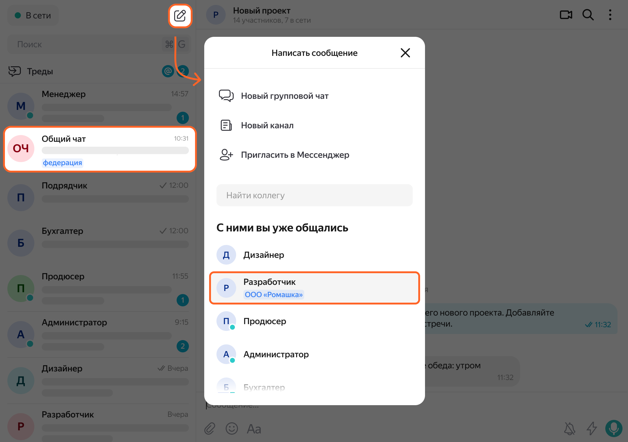 Организации Ромашка, Одуванчик и Лютик состоят в федерации. Иван из Ромашки создал групповой чат, добавил в него своих коллег и сотрудника из Одуванчика — Ольгу.