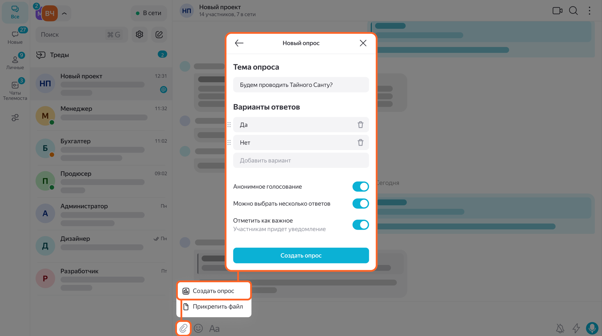 Чтобы узнать мнение большинства в групповом чате или канале, запустите опрос. Он может быть открытым или анонимным, с одним или несколькими вариантами ответа.