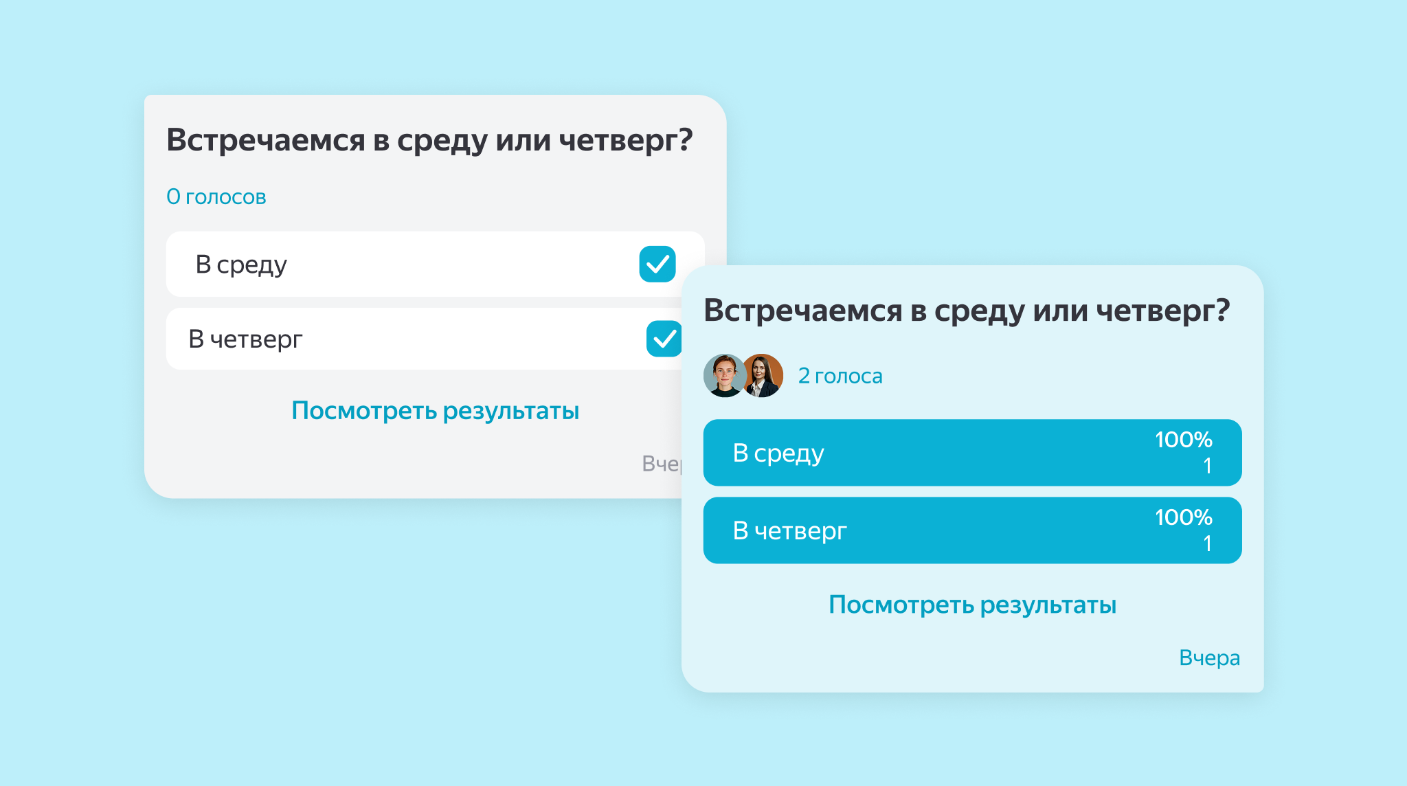 Как и кто проголосовал, можно посмотреть в Мессенджере или скачать результаты Excel-файлом. Если опрос был анонимным, результаты будут доступны только в Мессенджере — в обезличенном виде.