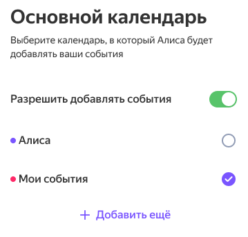 Вы можете выбрать основной календарь — это календарь, в который Алиса будет добавлять события. Такой календарь всегда один. Кроме основного календаря вы можете добавить несколько дополнительных — у Алисы будет доступ к информации о встречах из этих календарей, и она сможет рассказать вам о них, если спросите.