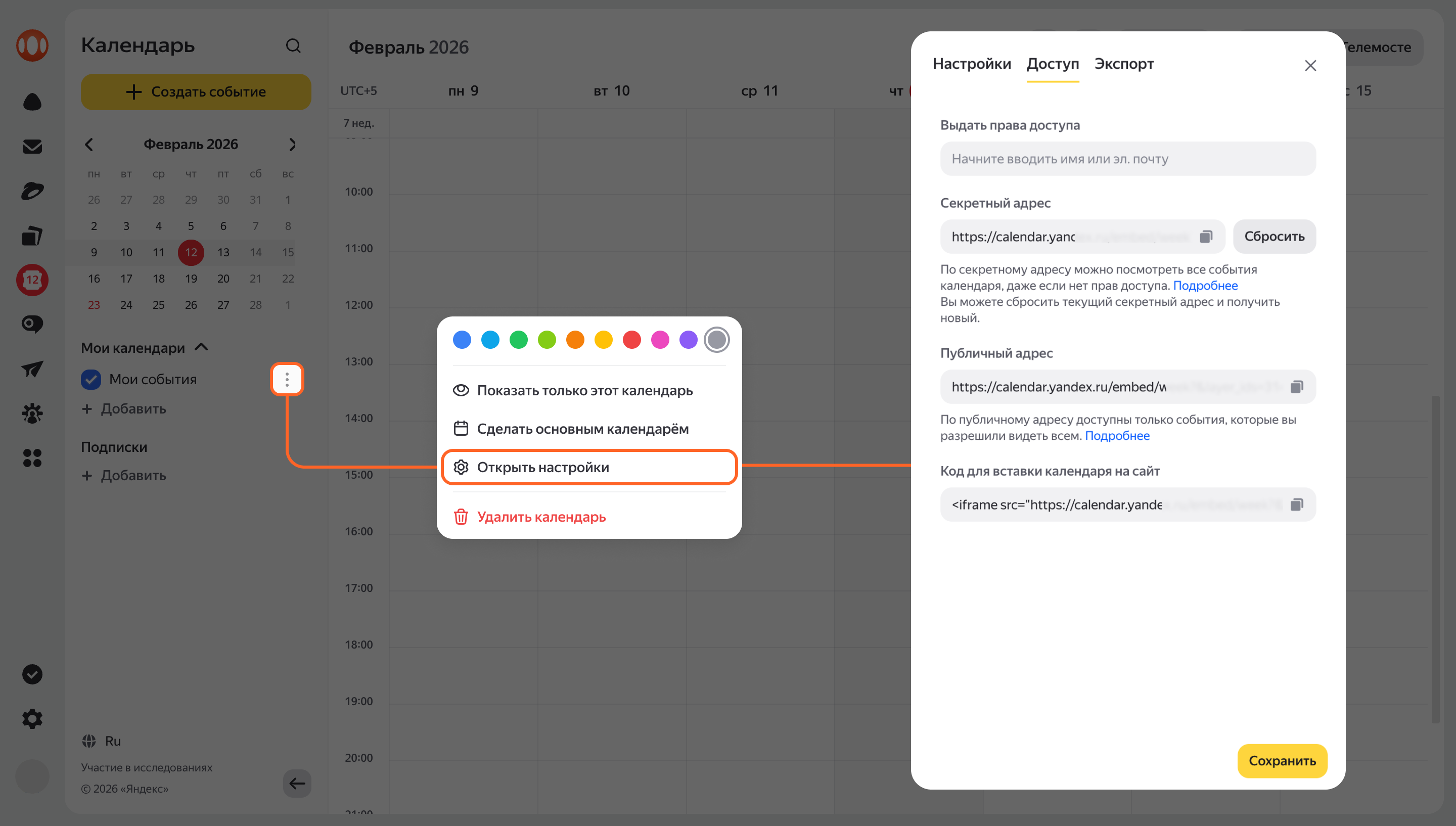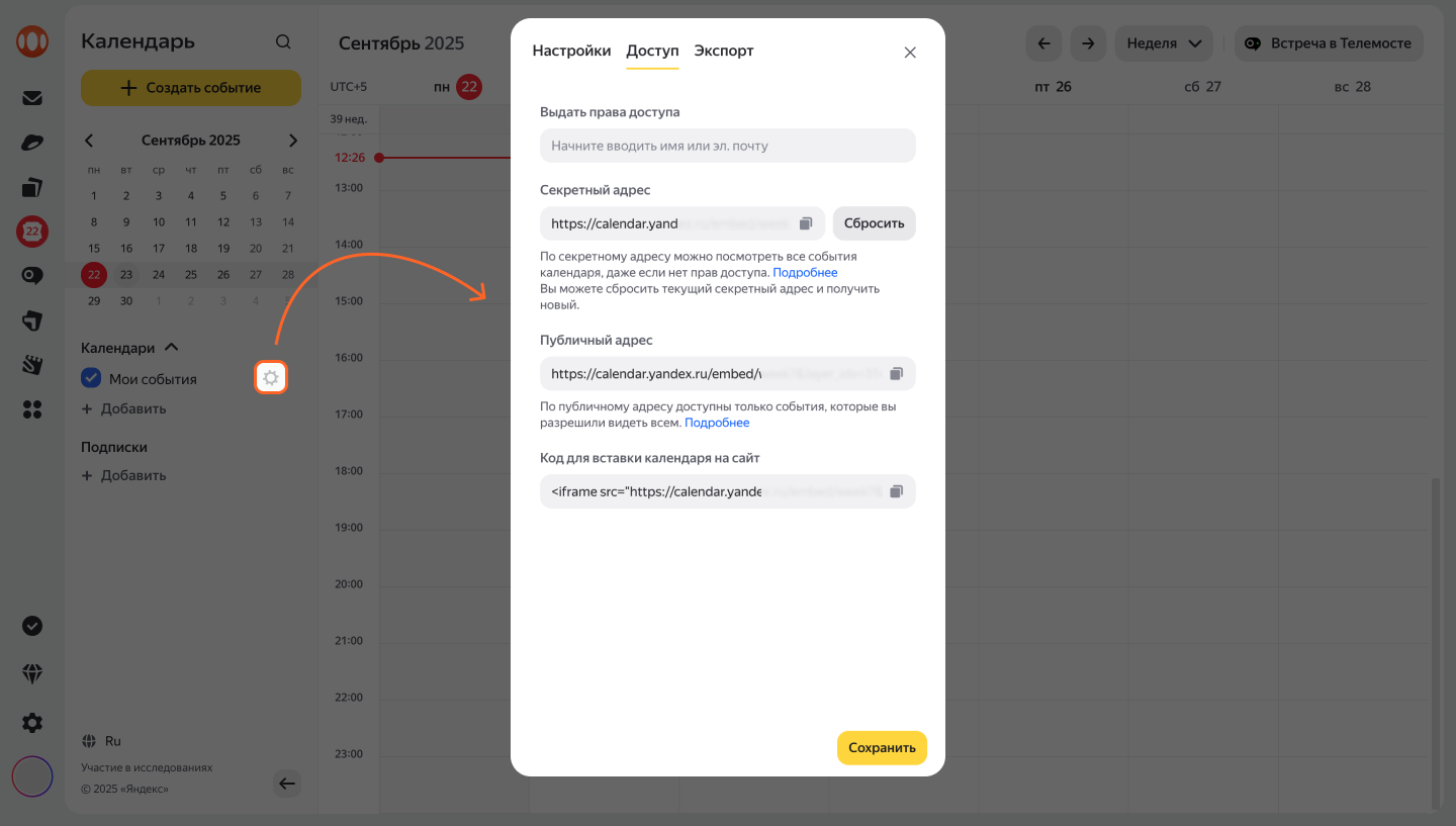 Если для некоторых событий в вашем календаре включена опция видимости Участники, такие события будут видны только их участникам. Если вы хотите поделиться всеми событиями, скопируйте данные из поля Секретный адрес.