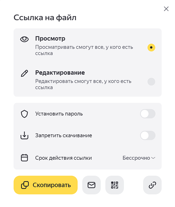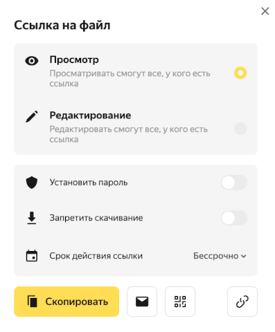 Запретите скачивание файла или папки — после перехода по такой ссылке кнопки Скачать и Сохранить на Яндекс Диск будут недоступны для других. У документов также будет недоступна печать, а у аудиофайлов — прослушивание из Диска.