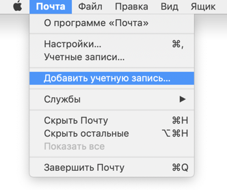 Запустите программу и откройте меню Почта → Добавить учетную запись, чтобы открыть мастер создания учетной записи.