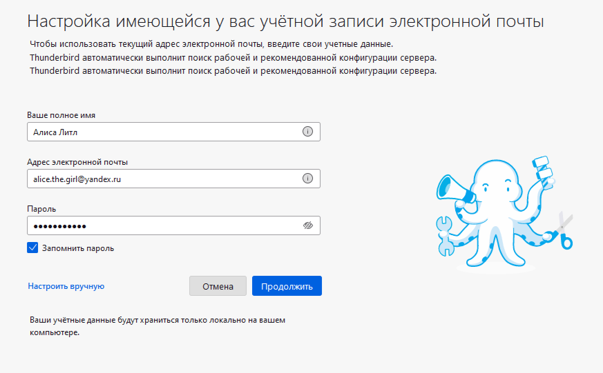 Нажмите кнопку Настроить вручную и укажите следующие параметры серверов электронной почты: