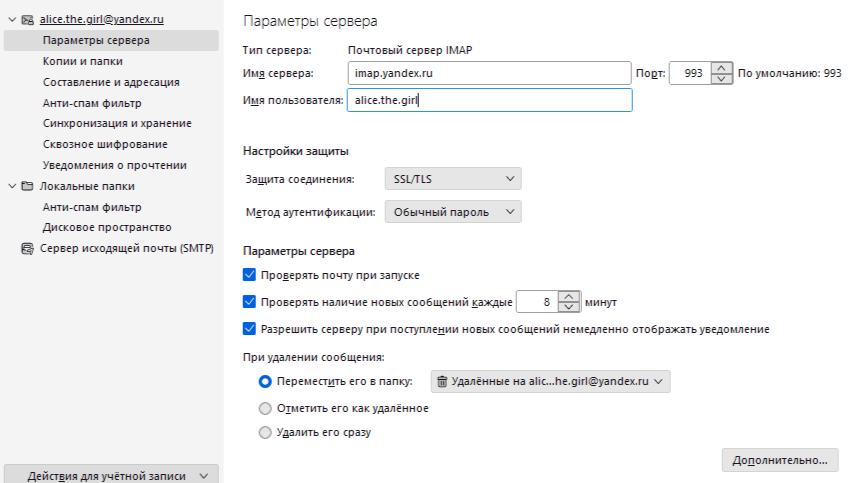 Если вы хотите, чтобы удаленные в почтовой программе письма оставались на некоторое время на сайте Яндекс Почты, включите опцию Отключить автоматическое удаление писем, помеченных в IMAP как удаленные. Окончательно письма удалятся с Почты после перезапуска почтовой программы.