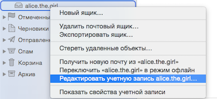 Нажмите на учетную запись правой кнопкой мыши (в списке папок) и выберите пункт Редактировать учетную запись.