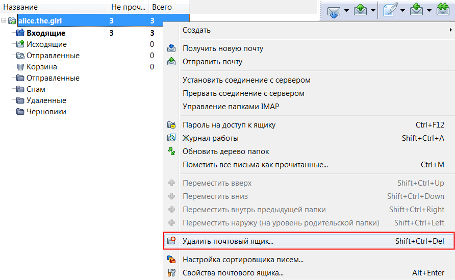 Нажмите на учетную запись правой кнопкой мыши (в списке папок) и выберите пункт Удалить почтовый ящик.