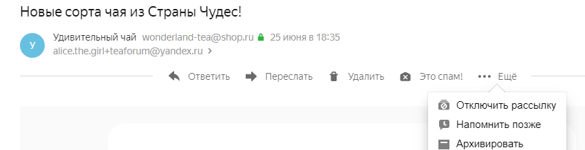 После того как вы нажмете кнопку, выбранное письмо попадет в папку Удаленные. Данная рассылка больше не будет приходить в ваш почтовый ящик.