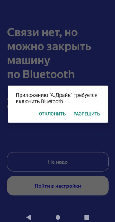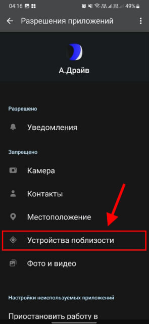 - Для Android убедиться, что в разрешениях приложения включено «Устройства поблизости». Нужно открыть Настройки телефона → Приложения → Яндекс Драйв → Разрешения → Устройства поблизости и нажать разрешить