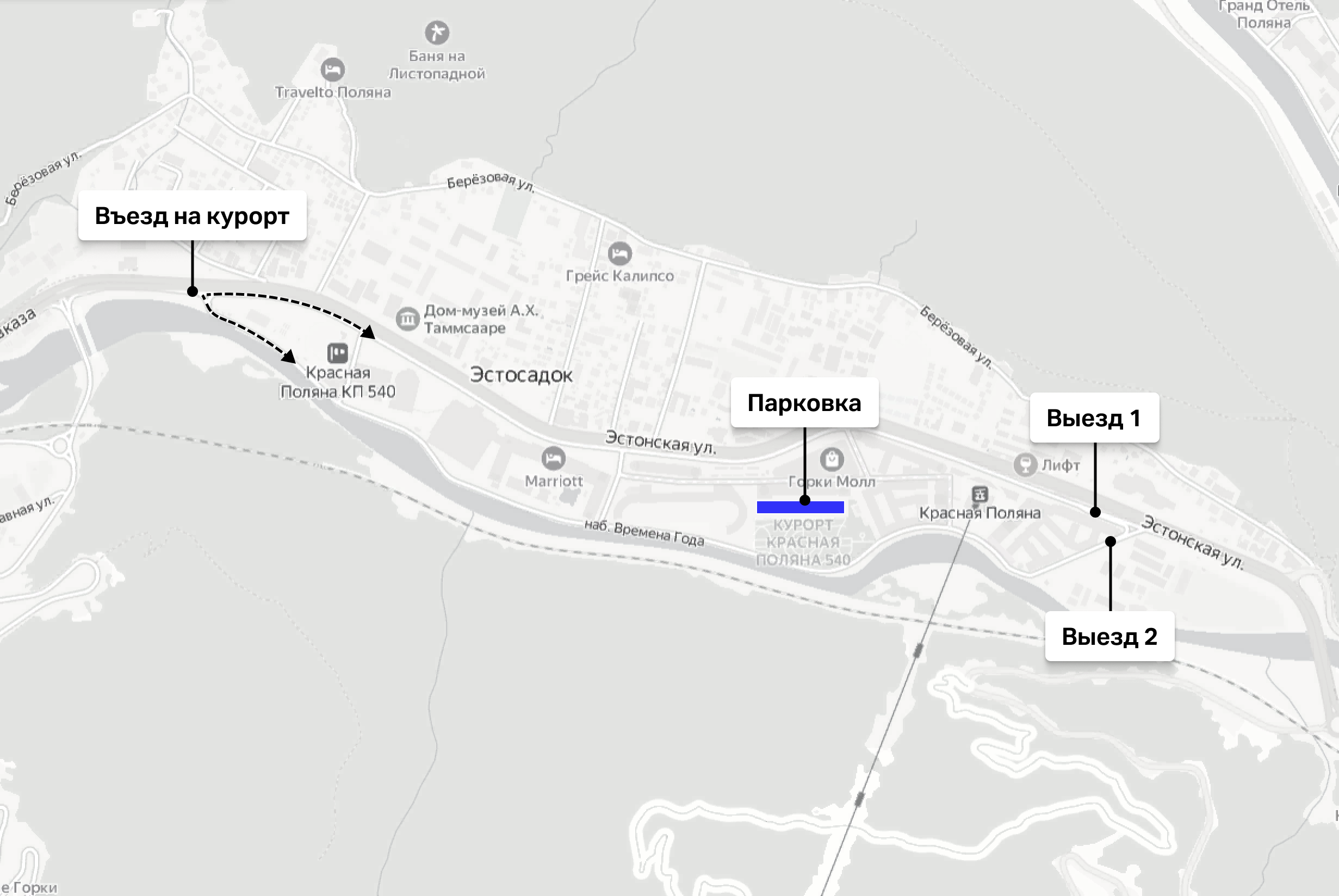 Для пользователей Драйва парковка в Красной поляне — бесплатная. Адрес парковки: село Эстосадок, ул. Горная Карусель, 4.