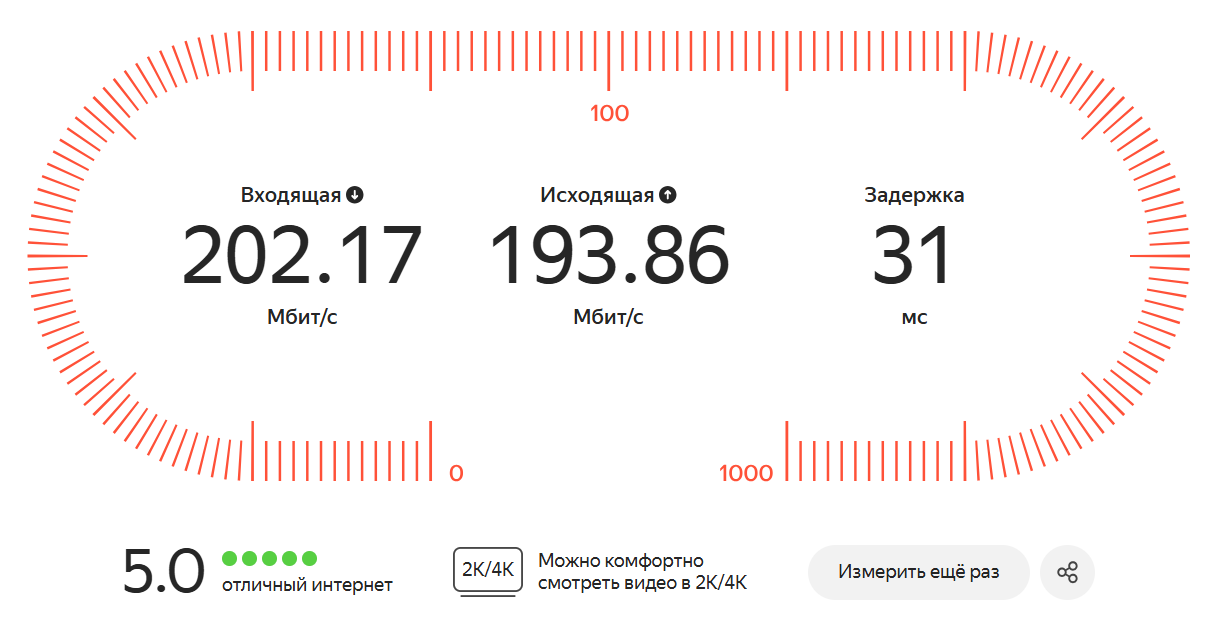 Качество соединения — по пятибалльной шкале и в текстовой форме (например, «Можно комфортно смотреть видео в 2K/4K»).